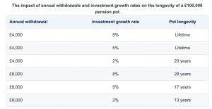 Their analysis examined two withdrawal scenarios based on a pension pot of £100,000 and applied a fixed withdrawal of £4,000 and a higher one at £8,000 per year. These are equivalent to 4% and 8% of the initial pot respectively and are commonly used according to the FCA retirement income data for 2023-2024.
