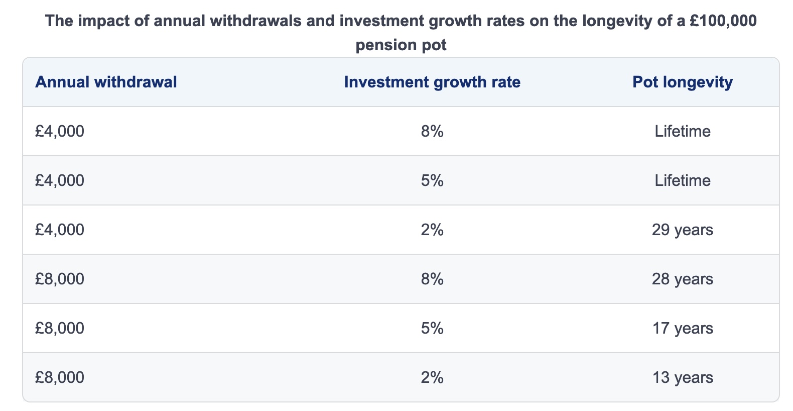 The figures show that pension pots could last anything from a lifetime to just 13 years, depending on the withdrawal and investment returns.