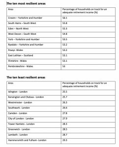 “It’s the reason why the ten least resilient places when it comes to retirement is dominated by London. Only 25.5% of households in Islington are on track for a decent pension income followed by Kensington and Chelsea with just 26% of households on track. They are followed by the likes of Westminster, Tower Hamlets and Lambeth.